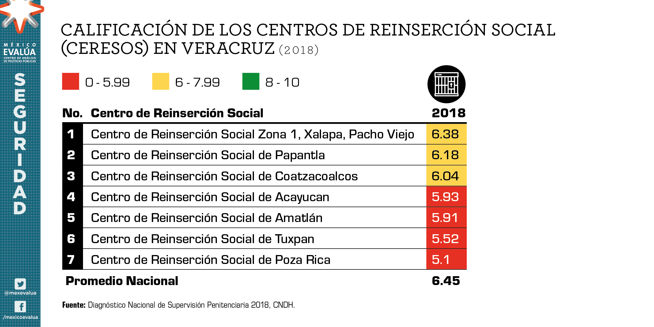 Por otro lado, la entidad tiene un sistema de prisiones deficiente. Las prisiones, como instituciones del Estado, son precisamente las encargadas de reinsertar a los delincuentes que han cumplido su condena en la sociedad. De acuerdo con el Diagnóstico Nacional de Supervisión Penitenciaria 2018 elaborado por la CNDH[7], existen siete centros de reinserción social en Veracruz, de los cuales cuatro reciben una calificación reprobatoria. También es preocupante que seis de los siete centros muestran condiciones de autogobierno o cogobierno, en donde prevalecen las actividades ilícitas y constantemente ocurren todo tipo de cobros (extorsión y sobornos) entre los internos y las autoridades penitenciarias.