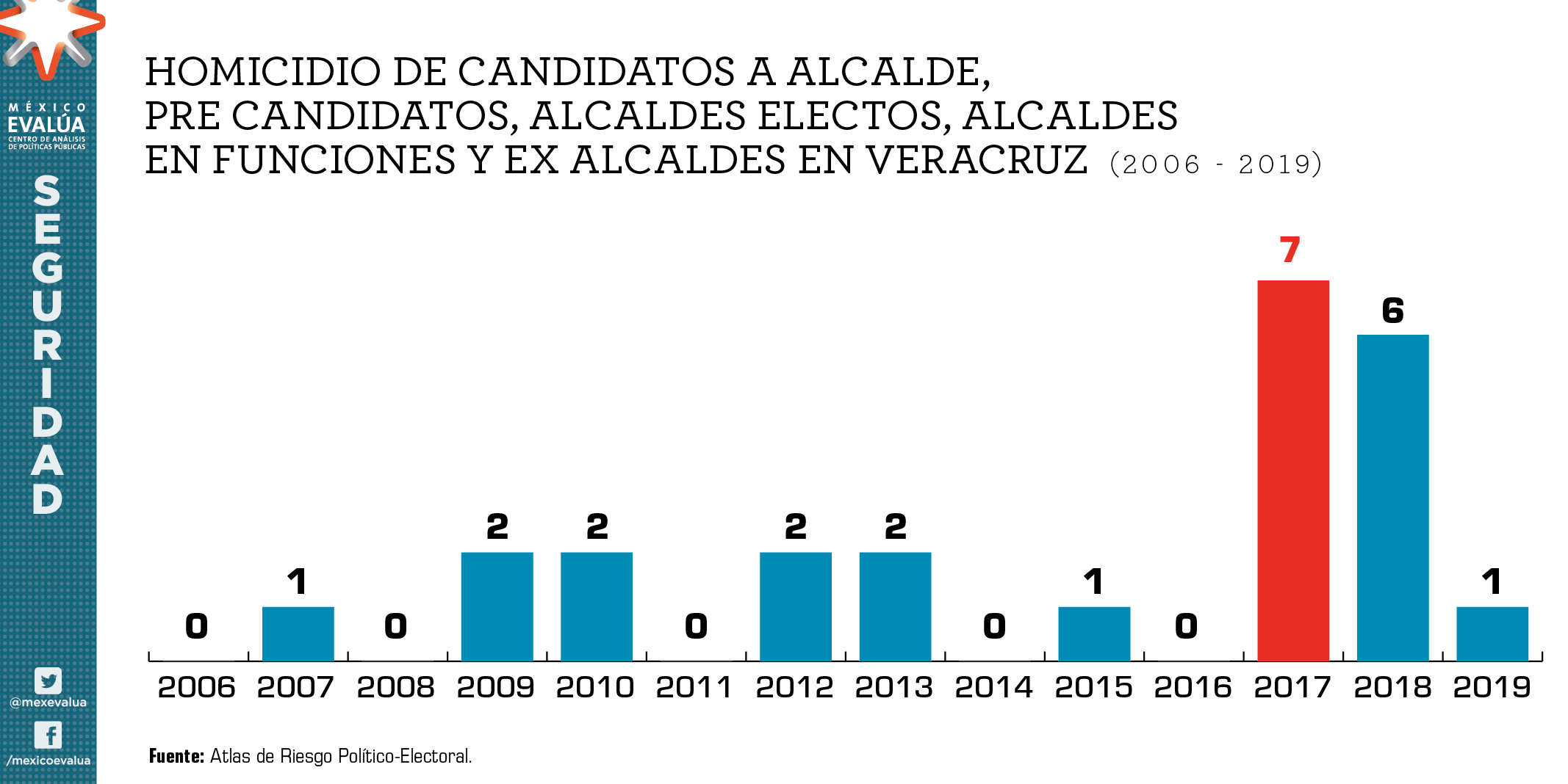 Las víctimas de homicidio no se limitan a las disputas entre los miembros del crimen organizado. La violencia letal representa un riesgo para la sociedad en su conjunto. Los asesinatos se han convertido en un riesgo latente para los servidores públicos en la entidad. El Atlas de Riesgo Político-Electoral, que recolecta información sobre servidores públicos asesinados, reporta que en Veracruz han muerto 24 personas que aspiraban a ser alcaldes, eran alcaldes en funciones o fueron alcaldes alguna vez. En este sentido, la violencia no discrimina por afiliación política, ya que entre los asesinados había militantes de todas las expresiones políticas. La víctima más reciente fue Maricela Vallejo, alcaldesa de Mixtla de Altamirano quien murió acribillada apenas en abril de 2019.