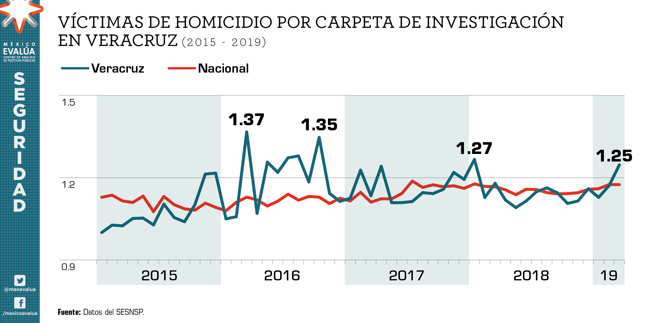 En ocasiones, hay varias víctimas por evento delictivo, lo cual se refleja en el promedio de víctimas de homicidio por carpeta de investigación. El promedio de Veracruz no sólo se encuentra por encima de la media nacional, sino que también refleja la tendencia ascendente de delitos homicidas que incluyen a más de una víctima.