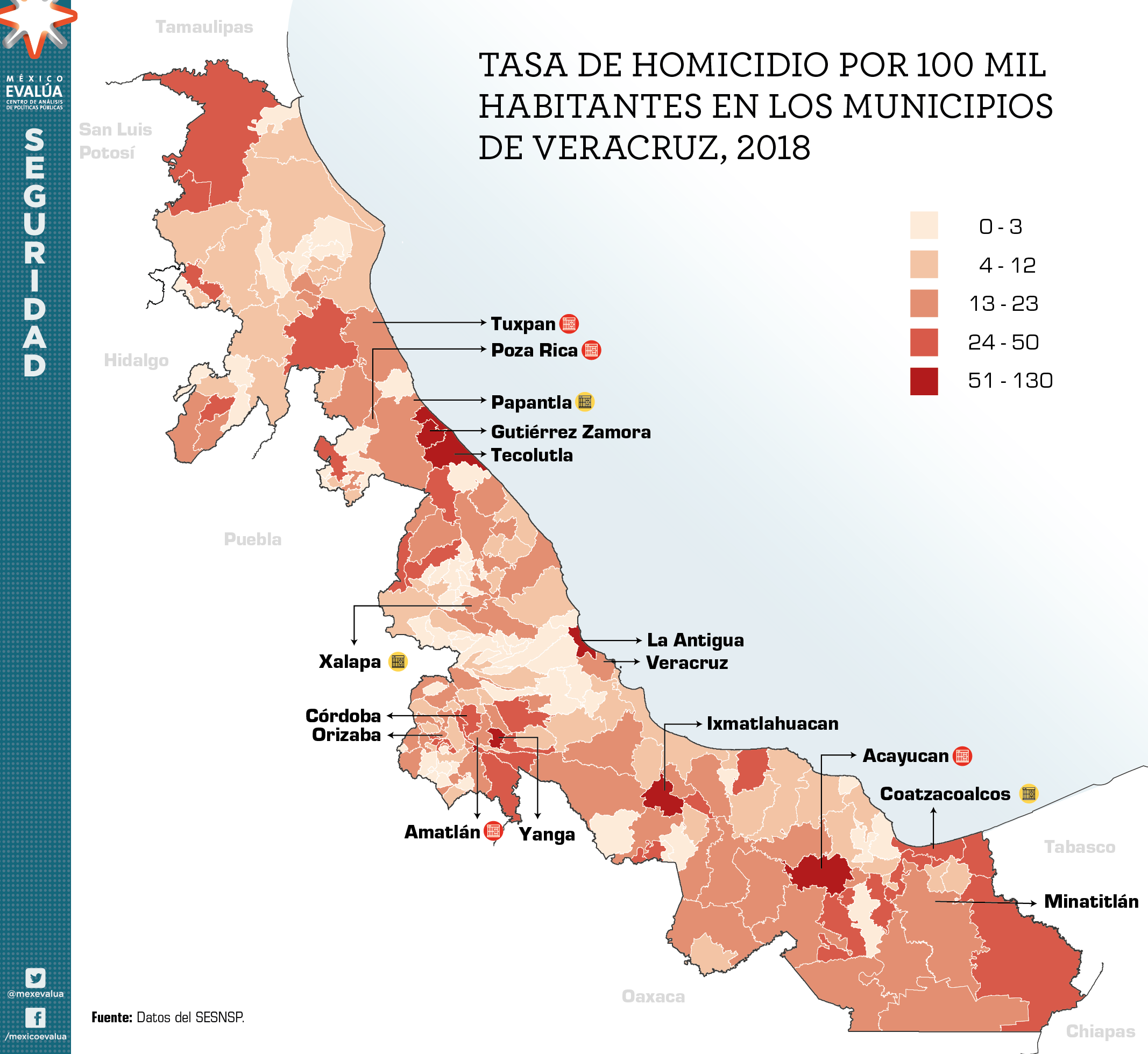 Los estados no son uniformes y los homicidios que ocurren no están distribuidos de manera uniforme a lo largo de los municipios. Por ello, y para diseñar políticas desde lo local, hace falta analizar en qué municipios ocurren los homicidios y cuáles tienen las tasas de homicidio por 100 mil habitantes más altas. Los municipios de Veracruz con las tasas más altas (poblaciones mayores a 10 mil habitantes) en 2018 fueron La Antigua (121.8), Gutiérrez Zamora (72.5), Acayucan (63.5), Yanga (63.0), Tecolutla (61.1), Pánuco (50.2), Coatzacoalcos (42.1), Córdoba (41.4), Rafael Delgado (39.6) y Coyutla (38.9)