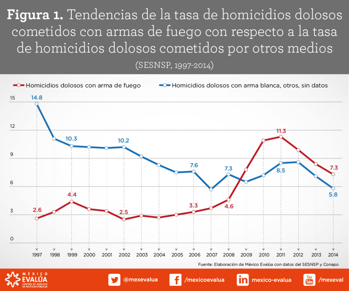 Otra forma gráfica de mostrar este fenómeno es observando la cantidad de homicidios dolosos cometidos con arma de fuego como proporción del total de homicidios, la cual aumentó de forma importante a nivel nacional entre 2008 y 2010, al pasar de 38.7 a 60.3 por ciento. Desde entonces, el porcentaje de homicidios cometidos con arma de fuego ha caído, pero se mantiene muy por encima de lo registrado antes de 2009. Es decir, hasta la fecha no se ha revertido tal fenómeno. Así, en 2014, 55.6 por ciento de las averiguaciones previas iniciadas por homicidios dolosos en el país encontraron que esos delitos ocurrieron con armas de fuego. Homicidios dolosos cometidos con arma de fuego