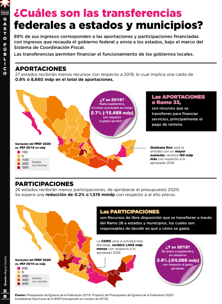 El 89% de los ingresos de estados y municipios corresponde a las aportaciones y participaciones financiadas ingresos que recauda el gobierno federal y le envía a los estados, bajo el marco del Sistema de Coordinación Fiscal. Y son muy importantes, pues permiten financiar el funcionamiento de los gobiernos locales.