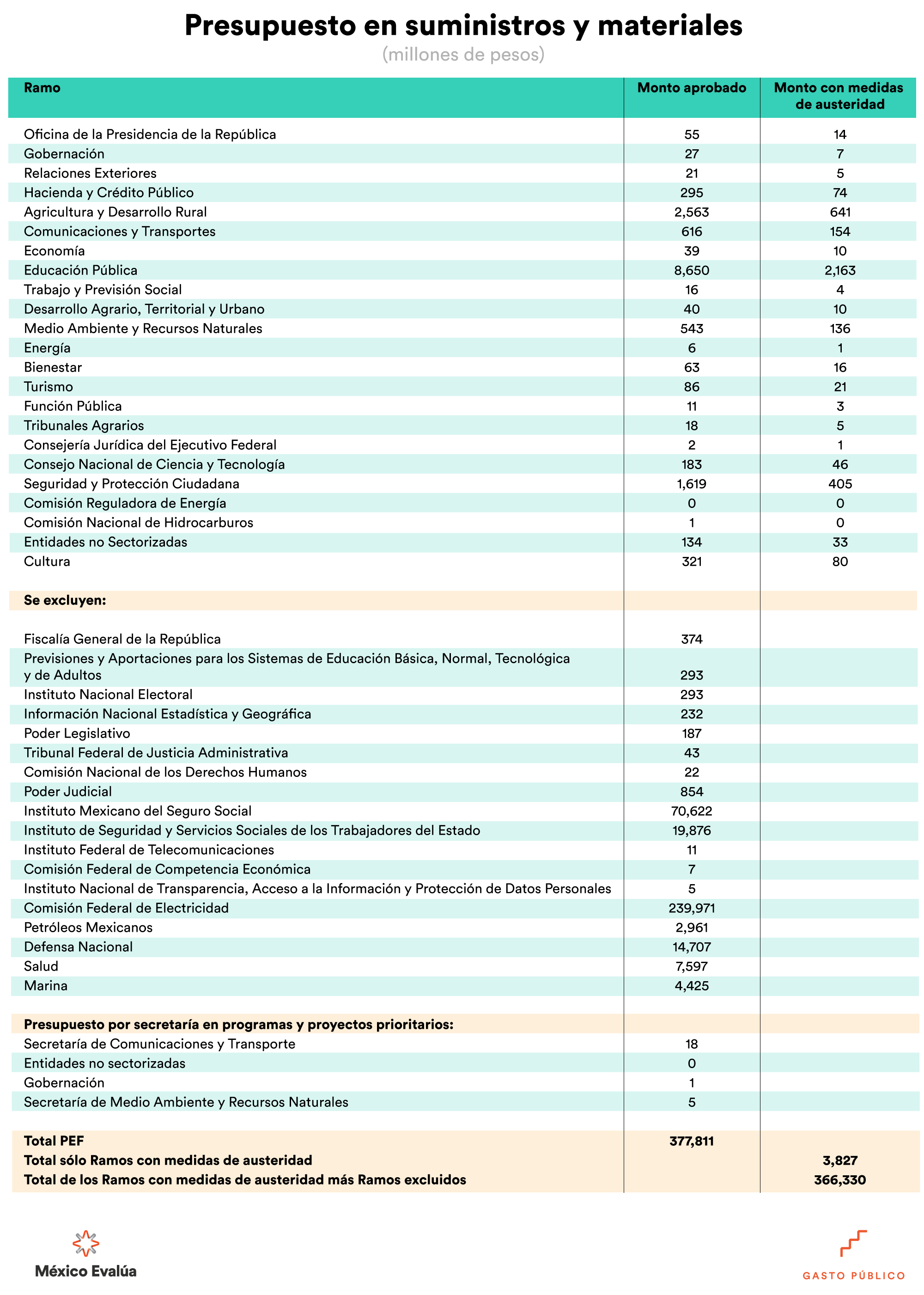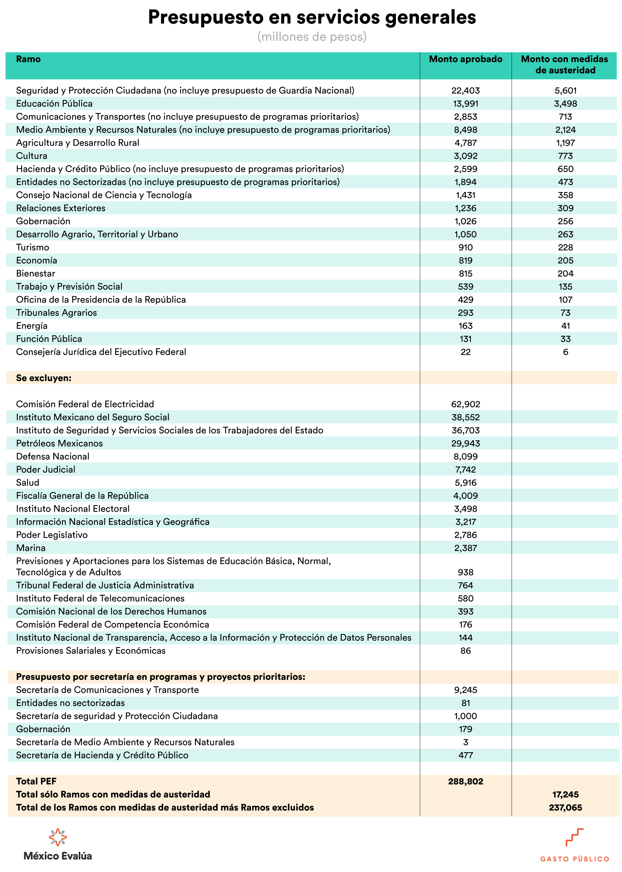 Con estas medidas el Gobierno Federal espera obtener 622 mil 556 mdp, y con ellos financiar programas sociales y proyectos prioritarios. De las medidas de austeridad se excluye la Secretaría de Salud, la Secretaría de Marina, Defensa Nacional, la Guardia Nacional, IMSS, ISSSTE y las Empresas Productivas del Estado (Pemex y CFE), entre otros. En algunas secretarías se excluyeron de las medidas de austeridad a ciertos programas y proyectos prioritarios.
