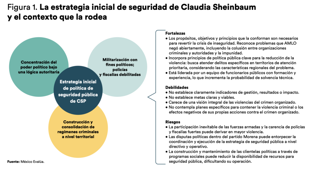Para realizar este balance identificamos y analizamos los focos rojos del crimen y la violencia en este arranque de sexenio, las principales acciones del gobierno federal en materia de seguridad pública y la alineación entre ambos elementos. En dicho marco, caracterizamos la estrategia de seguridad de CSP, enunciamos las principales continuidades y divergencias frente a la deficiente política de militarización de la seguridad de López Obrador y sus aciertos y errores. Con base en lo anterior, enlistamos recomendaciones de política pública buscando contribuir a la pacificación sostenida del país.
