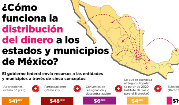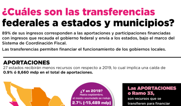 En 2019, de cada 100 pesos que la Federación transfirió a los municipios y estados, 48 pesos correspondierobn a participaciones; 41 pesos a aportaciones; 6 pesos a convenios entre la Federación y gobiernos locales; 4 pesos a protección social en salud y un peso a subsidios del Ramo 23.