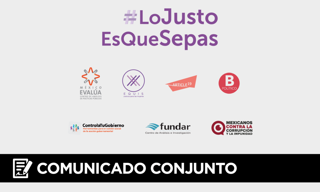 [1] El colectivo está integrado por EQUIS Justicia para la Mujeres (EQUIS), Mexicanos Contra la Corrupción y la Impunidad (MCCI), México Evalúa, Borde Político, Artículo 19, Controla tu Gobierno y Fundar.