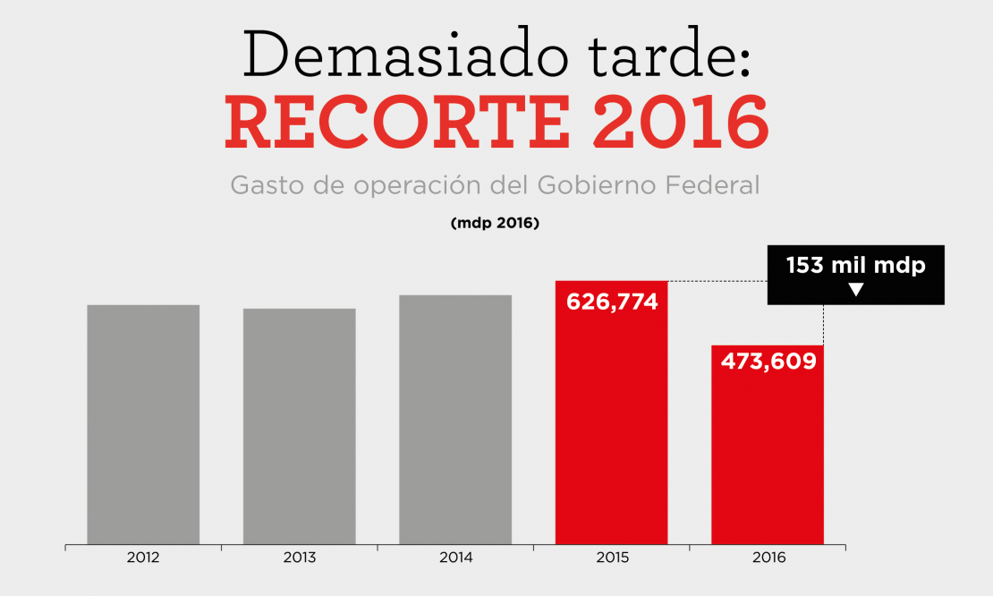 Al analizar las cuentas, se observa que se dio un recorte de 153 mil millones de pesos en el gasto operativo[2] del gobierno, lo que representó una disminución de 24 por ciento en términos reales respecto de lo gastado en este rubro en 2015.