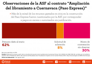 Aquí algo de contexto: en 2014, la Secretaría de Comunicaciones y Transportes (SCT), por medio del Centro SCT Morelos, inició el proyecto de infraestructura Paso Express, el cual consistía en la ampliación del libramiento de Cuernavaca. Su realización requirió la celebración de 13 contratos de obra pública y servicios relacionados[1], cuyo monto de adjudicación inicial sumó un total de 1,124.7 mdp. Uno de estos contratos fue el más relevante, ya que en éste se adjudicó 93% (1,045 mdp) del monto total inicial.