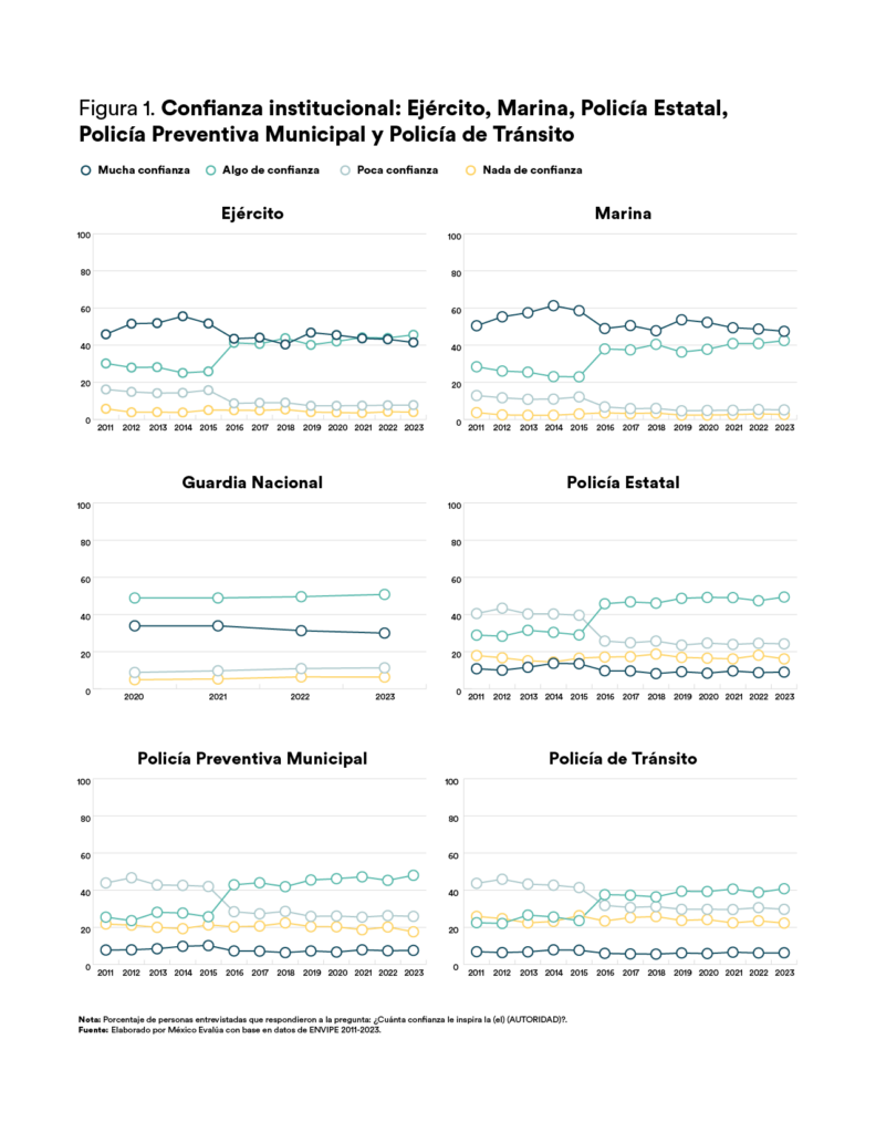Más allá de estos contrastes, hay un elemento adicional que queremos destacar entre los resultados de la Envipe 2023, a la luz del cúmulo de datos de los levantamientos anteriores: visos de un descenso en la confianza en las Fuerzas Armadas, y el sugerente inicio de la recuperación de la confianza en las policías estatales y municipales.