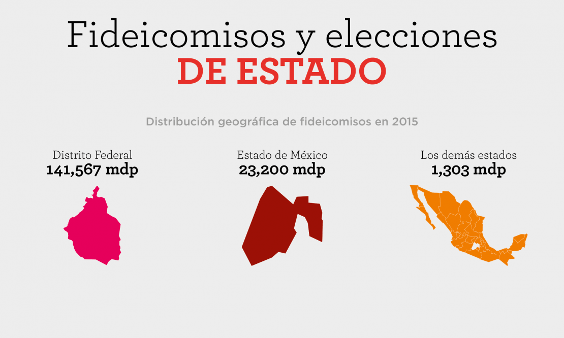 En 2012, último año de gobierno de Felipe Calderón, el Estado de México recibió la menor transferencia per cápita del Gobierno Federal de todas las entidades federativas del país (2 mil 43 millones de pesos). Tres años después, a la mitad del término de la administración de Enrique Peña Nieto, el Estado de México recibió una transferencia per cápita mucho mayor que la de 2012 (3 mil 987 millones de pesos), que le permitió escalar su posición 13 lugares. Fue el estado que recibió el mayor aumento en el periodo. Se encontró que este aumento se debía en gran medida a una asignación de 23 mil millones de pesos a través del concepto “Transferencias a fideicomisos, mandatos y otros análogos”. En 2015, el Estado de México se benefició del 14% del total de las transferencias a fideicomisos.