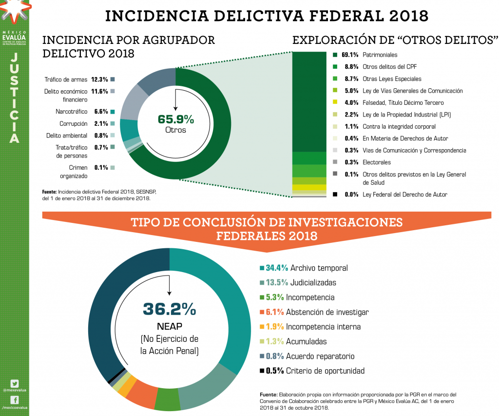 No obstante lo anterior, el 54.5% restante de los delitos que conoce la Fiscalía refieren a otro tipo de criminalidad, aquella que se caracteriza por involucrar una lógica de mercados criminales y cuya investigación es más compleja, ya que requiere de operadores con capacidades analíticas, de construcción de inteligencia y diseño de estrategias. De acuerdo a los registros de la Fiscalía para octubre 2018, del total de estos delitos, 12.3% se relacionaban con tráfico de armas, 11.6% con delitos económicos financieros, 6.6% con narcotráfico, 2.1% con corrupción y 0.7% con tráfico de personas.