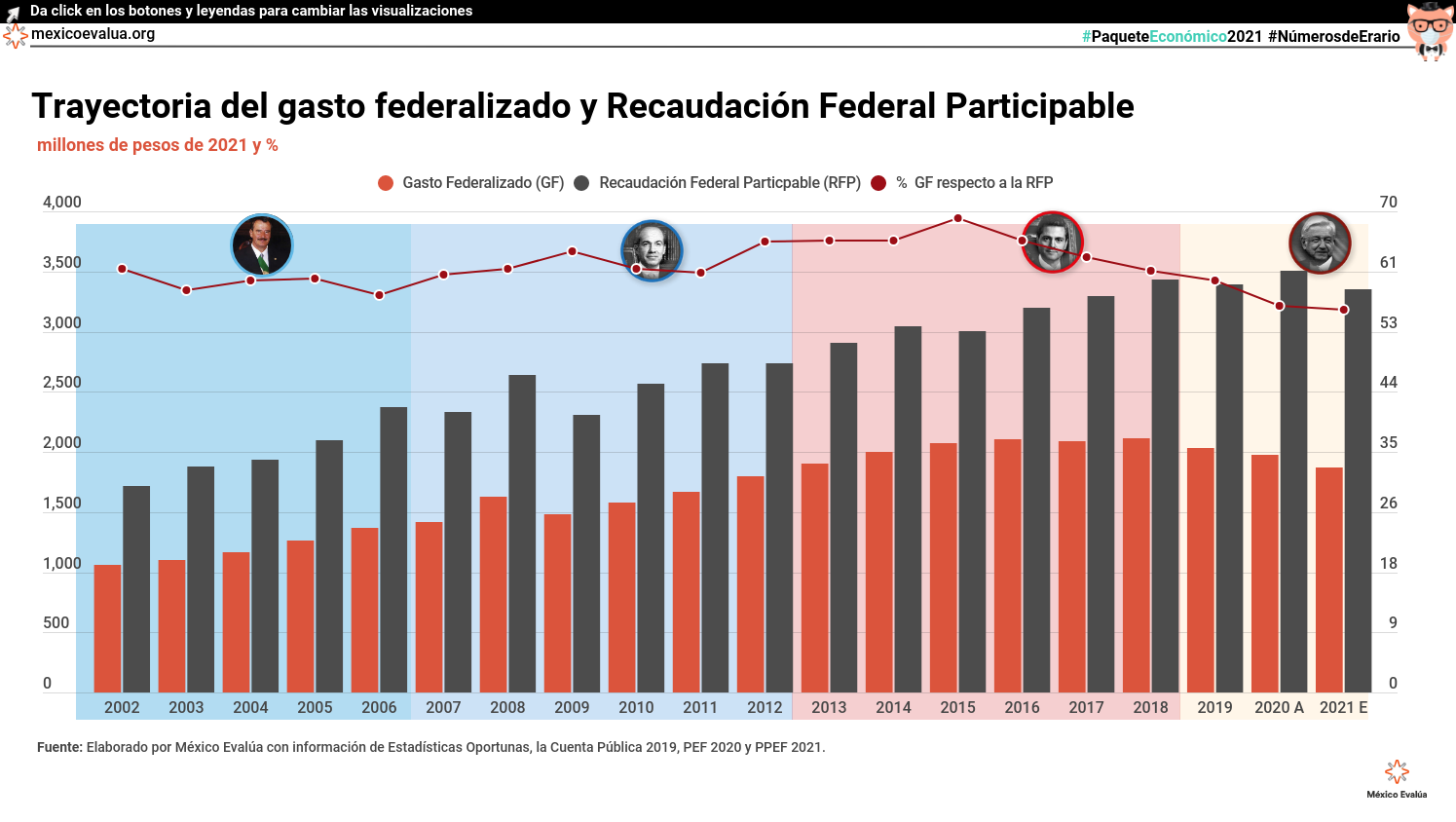 El gasto federalizado ha dejado de tener peso en la RFP en los últimos años, después de varios años en los que se le dio cierta prioridad. Para 2021 se propone que el gasto federalizado represente el 55.7% de la RFP, una proporción menor que en el presupuesto aprobado en 2020 (56.3%), y la más baja en lo últimos años.