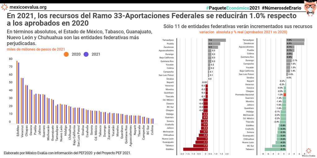 En términos absolutos, los estados con mayor disminución en sus recursos vía transferencias del Ramo 33 son: Estado de México (-2.2 mmdp), Tabasco (-1.3 mmdp), Guanajuato (-1.1%), Nuevo Léon (-1.0 mmdp) y Chihuahua (-0.8%).