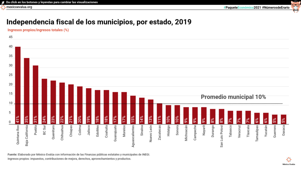 Las aportaciones y participaciones son la fuente principal de recursos para la mayoría de estados, municipios y alcaldías de Ciudad de México. En 2019, las transferencias federales en promedio representaron 84.9% de los ingresos totales estatales, mientras que los ingresos propios[8] representaron sólo el 15.1%. Por encima de este promedio se encontraron apenas seis entidades federativas: Ciudad de México, Estado de México, Sonora, Nuevo León, Quintana Roo y Sonora.