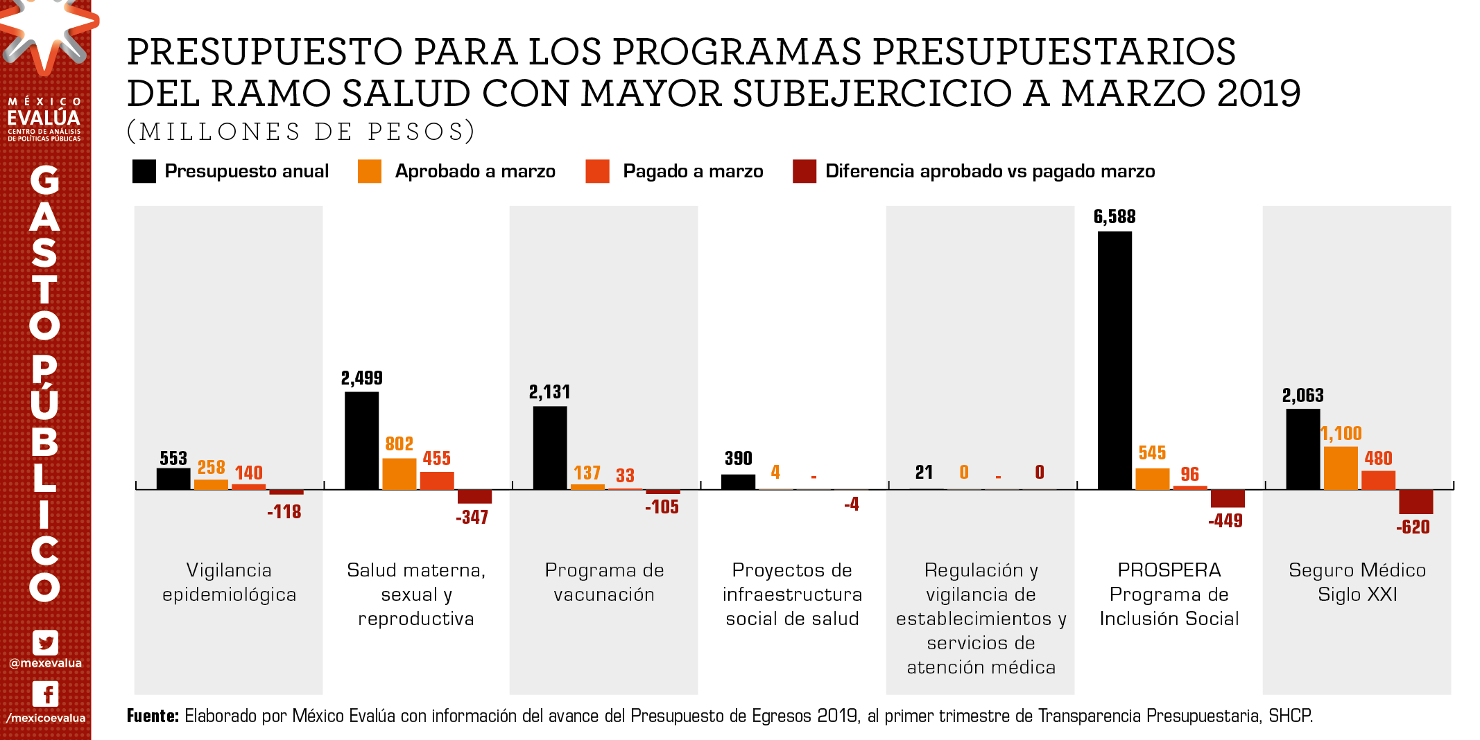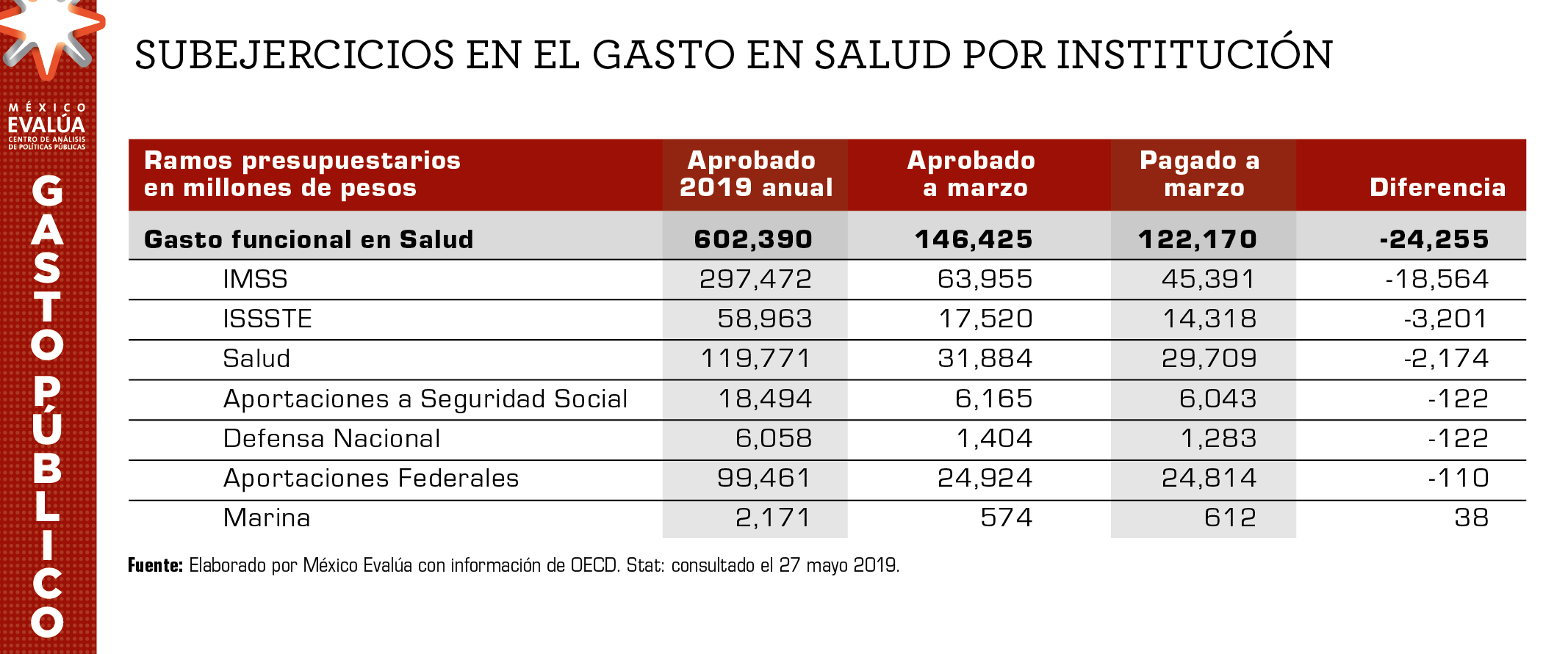 A marzo, destacaron los subejercicios por casi 7,300 millones de pesos en los conceptos de gasto relacionados con la compra de fármacos y productos químicos de laboratorio, así como el pago a servicios profesionales por 1,619 millones y el gasto para reparación y mantenimiento de instalaciones.