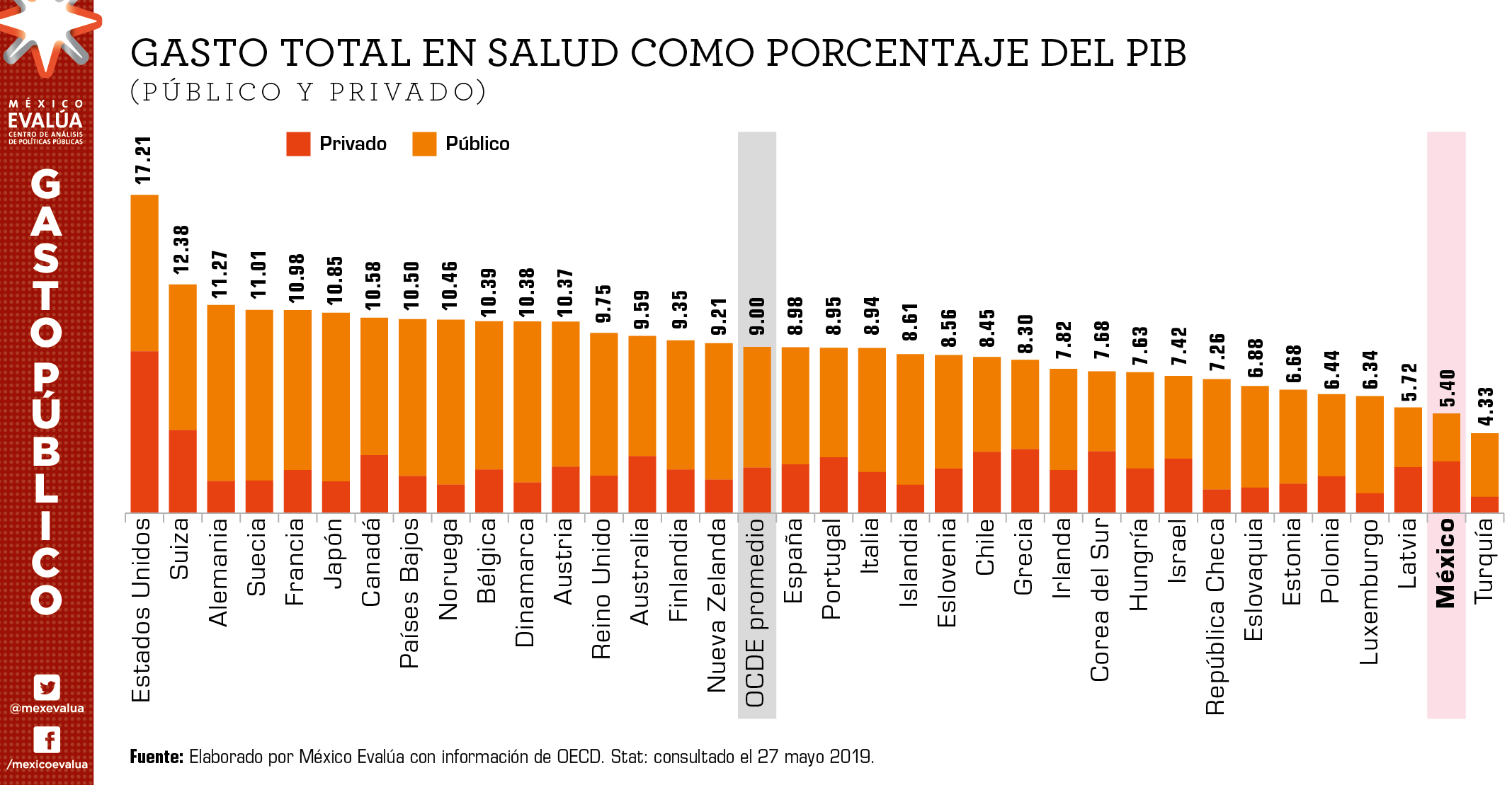 Otra consecuencia del bajo nivel de gasto público en Salud es el fuerte impacto en los bolsillos de la población, que tiene que pagar con recursos propios atención médica y medicamentos en el sector privado. Eso, se sabe, contribuye a la prevalencia de la pobreza en la familias. En México el gasto privado es mayor al gasto público en salud, lo cual también lo coloca en desventaja, como se observa en la siguiente gráfica…