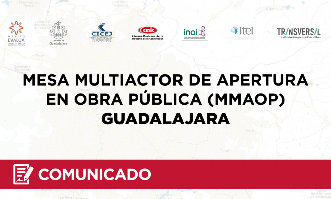 El gobierno de Guadalajara y México Evalúa, a través de su iniciativa #OjosalaObra, establecieron hoy un mecanismo de apertura gubernamental denominado Mesa Multiactor de Obra Pública (MMAOP). En ésta se regula y coordina la participación de actores estratégicos en materia de infraestructura pública y transparencia gubernamental en el municipio, con el fin de publicar más y mejor información sobre los proyectos de infraestructura y sus contratos a través de un nuevo sitio de internet.