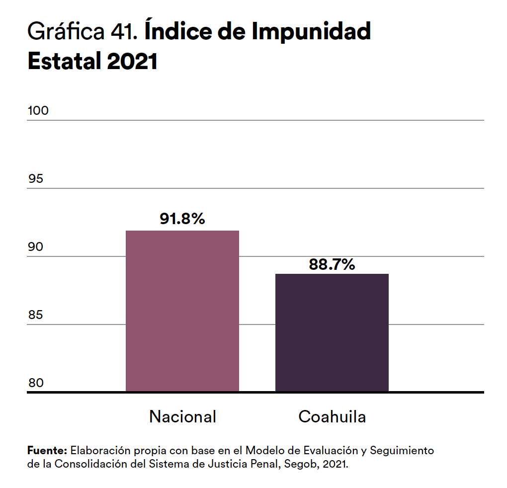 En 2021 se registró un incremento de la incidencia delictiva en el estado del 15.60%, y se estimó que la cifra negra, durante 2020, fue de 92.7%, por debajo de la nacional. Al mismo tiempo, el índice de confianza ciudadana muestra que hubo un incremento de la confianza a nivel estatal, mientras que se registró una reducción a nivel nacional, y que las autoridades con mayor confianza neta en Coahuila –consideradas dentro de la encuesta– fueron los jueces, el Ejército y la Marina. Estos factores son determinantes de la demanda social de los servicios públicos que ofrece el SJP en Coahuila, por lo tanto, analizamos la capacidad institucional para atenderla.