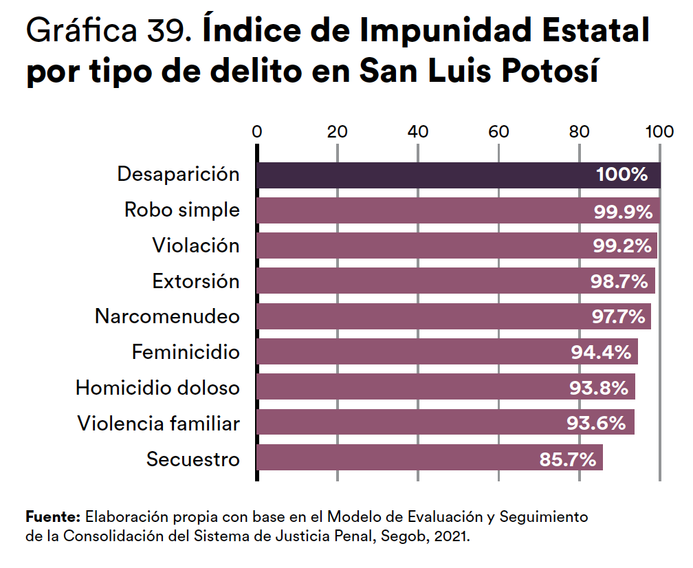 Asimismo, San Luis Potosí registró un aumento de la cifra negra respecto al año anterior, mientras que el delito con menor porcentaje de cifra negra fue el robo total de vehículos.