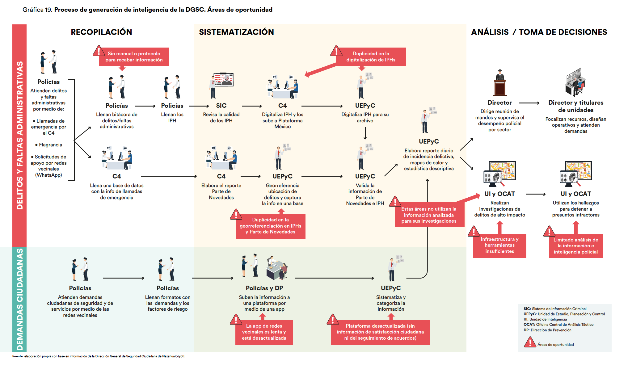 Llevamos a cabo sesiones de trabajo de campo, en las que realizamos observación participante, entrevistas semiestructuradas y grupos de enfoque. Gracias a ello, logramos reconstruir el circuito por donde fluye toda la información que usa la policía para atender el fenómeno criminal.