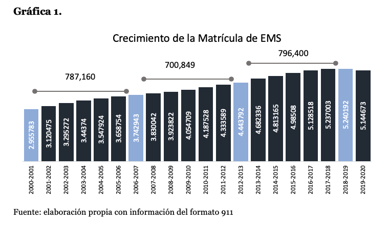 Ahora bien, los resultados del cambio de la matrícula del nivel medio superior más recientes en el ciclo 2019-2020 indican que no hubo crecimiento del número absoluto de alumnos, sino que de hecho hubo una reducción absoluta respecto al ciclo escolar previo de casi 100 mil estudiantes. Si el rasgo de innovación que se ha querido imprimir a la EMS es la entrega de becas a todos los alumnos del nivel, sin importar la condición económica de los hogares, ciertamente no parece haber tenido resultados en 2019 en cuanto a propiciar un aumento en la matrícula y —por consiguiente— en la cobertura escolar.