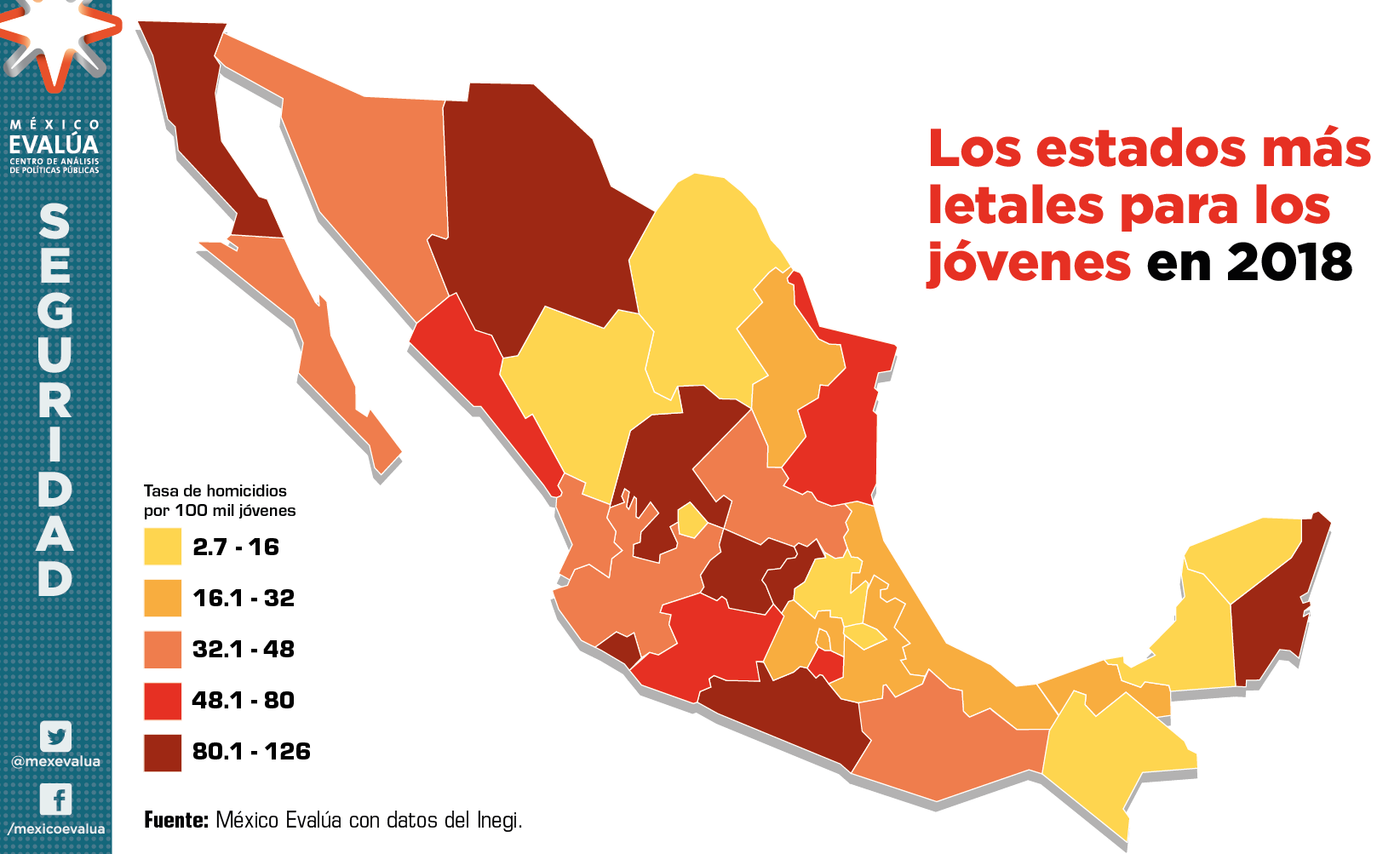 ¿Cuáles son los estados más letales para los jóvenes? Colima, Chihuahua y Baja California. ¿Los menos violentos? Yucatán, Aguascalientes y Campeche.