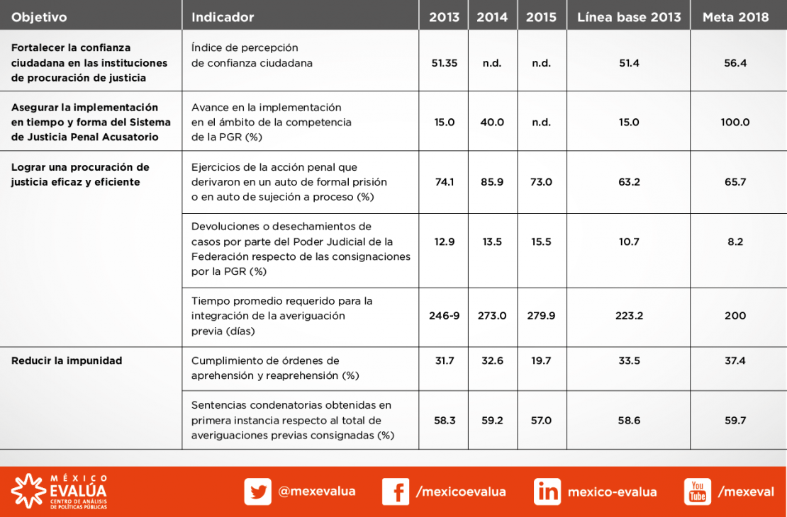[1] Específicamente, en el informe se incluyen los siguientes indicadores del Programa Nacional de Procuración de Justicia 2013-2018: a) percepción de confianza ciudadana, b) avance en la implementación del sistema de justicia penal acusatorio en el ámbito de competencia de la PGR, c) porcentaje de ejercicios de la acción penal que derivaron en un auto de formal prisión o en auto de sujeción a proceso, d) porcentaje de devoluciones o desechamientos de casos por parte del Poder Judicial de la Federación respecto de las consignaciones remitidas por la PGR, e) tiempo promedio requerido para la integración de la averiguación previa, f) porcentaje de cumplimiento de órdenes de aprehensión y reaprehensión, y g) porcentaje de sentencias condenatorias obtenidas en primera instancia respecto al total de averiguaciones previas consignadas.