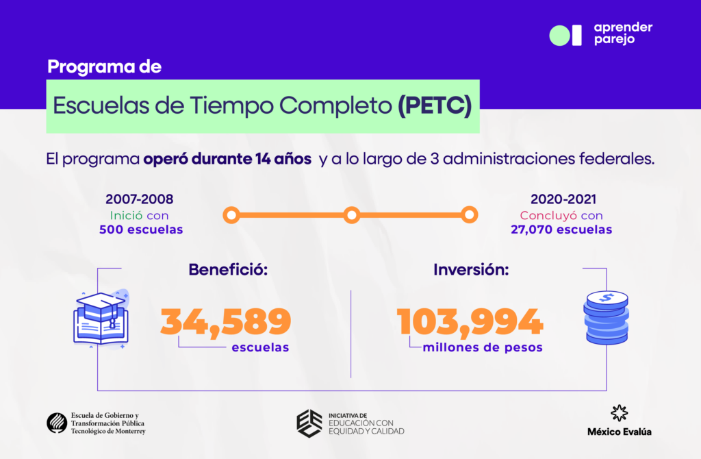 Para la primera década del siglo XXI, las autoridades comenzaron a reconocer este talón de Aquiles, y en el ciclo escolar 2007-2008 se creó el Programa de escuelas de tiempo completo (PETC), que extendió el horario escolar a seis u ocho horas diarias. En la implementación del PETC se definió un servicio de alimentación escolar y la necesidad de acompañar el nuevo horario con una propuesta pedagógica que aprovechara las horas adicionales de clase para mejorar los aprendizajes de las y los estudiantes.