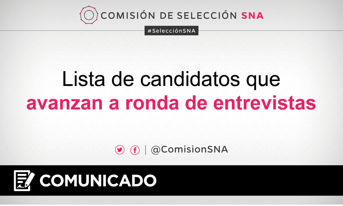 - La Comisión de Selección del Sistema Nacional Anticorrupción anuncia las candidaturas que avanzan a la etapa de entrevistas para ocupar una posición en el Comité de Participación Ciudadana.