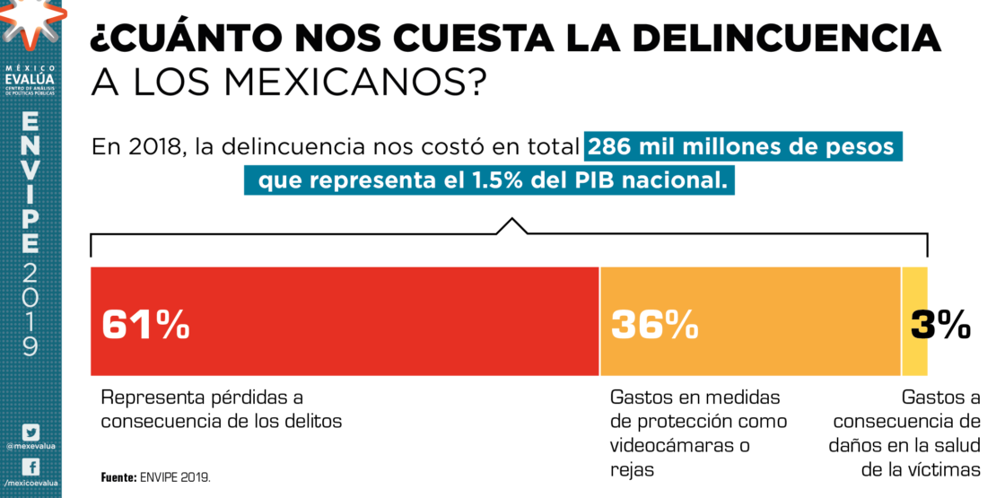 México Evalúa analizó los más recientes datos de la Encuesta Nacional de Victimización y Percepción sobre Seguridad Pública (ENVIPE) 2019, elaborada anualmente por el Instituto Nacional de Estadística y Geografía (INEGI), y encontró que los delitos cometidos durante 2018 costaron 286 mil millones de pesos, que representa el 1.5% del PIB nacional.