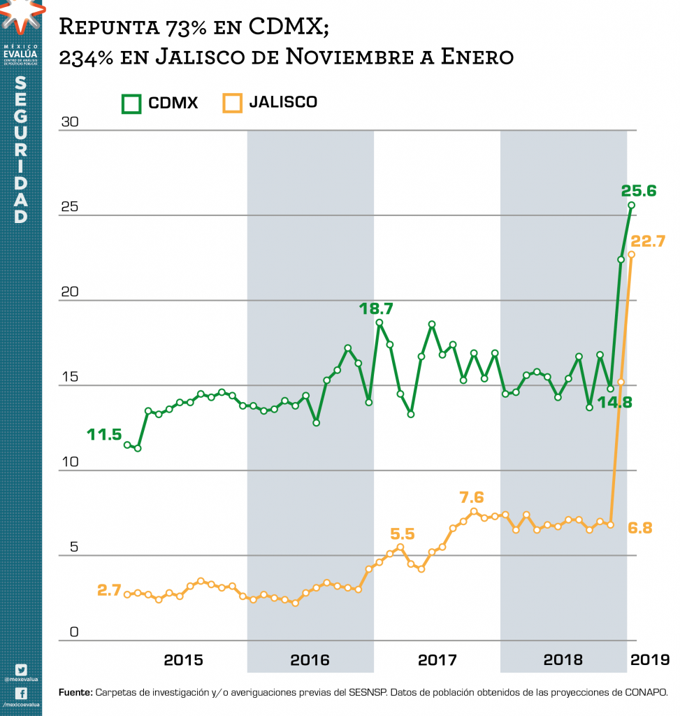 Es muy notable el aumento en la tasa de robo a negocio en la Ciudad de México y Jalisco. La evolución de este delito en otros estados sigue su tendencia, pero en las entidades señaladas hubo saltos importantes. En la capital hubo un aumento de 73% en dos meses: pasó de una tasa de robo mensual de 14.8 en noviembre de 2018 a 25.6 en enero de 2019. En noviembre del año pasado, Jalisco tenía una tasa de 6.8 robos y para enero de este año alcanzó una tasa de 22.7: esto significa que se incrementó 234% en tan sólo dos meses.
