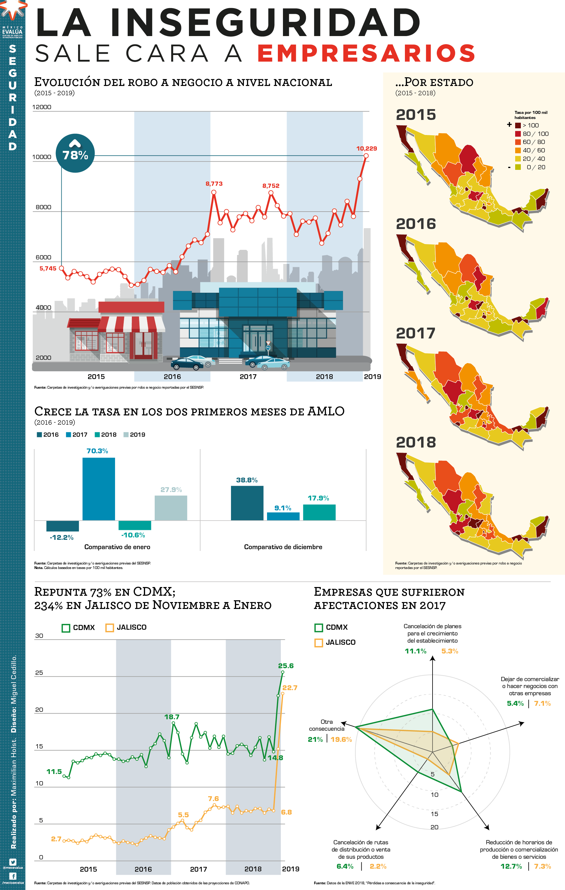 Por otro lado, el robo a empresas incrementó en los primeros dos meses de la administración del presidente Andrés Manuel López Obrador. Al comparar diciembre de 2018 con diciembre de 2017, este delito aumentó 19%, mientras que para enero de 2019 el robo subió 29.1% con respecto al año anterior.