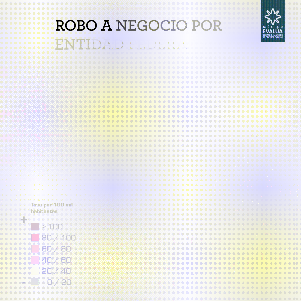 [2] La métrica más correcta para medir los robos es la tasa de robo por 10 mil unidades económicas. Debido a que sólo se cuenta con información bianual de dicha métrica, se hace una aproximación mensual empleando la tasa por 100 mil habitantes. Las entidades con las tasas más altas de robo por 10 mil unidades económicas en 2017 fueron Michoacán (13,082), Aguascalientes (11,866), Guerrero (11,761), Campeche (11,625), Ciudad de México (11,605), Chihuahua (11,322) y Baja California Sur (10,883).