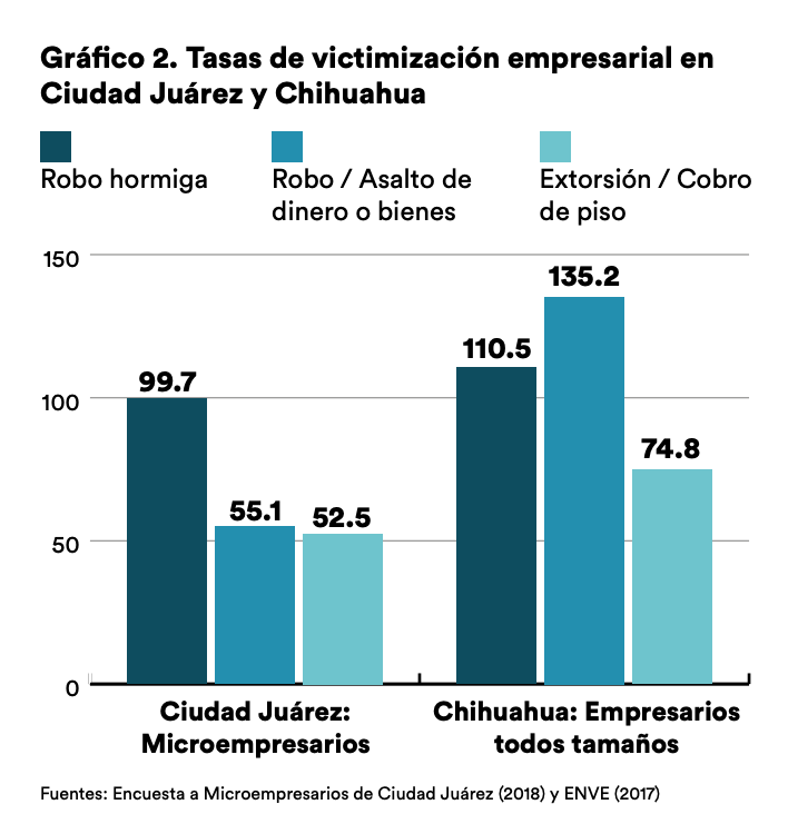 La extorsión tuvo un incremento del 49% en el estado de Chihuahua entre 2015 y 2019, y casi la mitad de los casos se concentran en Ciudad Juárez. Es un delito que afecta principalmente a micro y pequeñas empresas, y en la mayoría de los casos están involucradas bandas del crimen organizado.