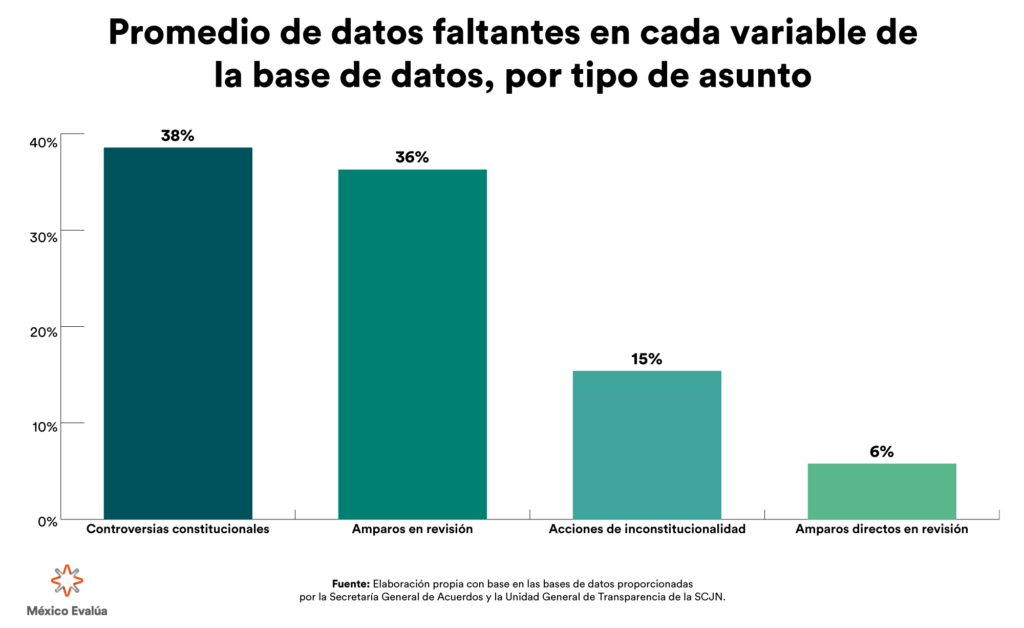 Finalmente, encontramos que el promedio de datos faltantes por cada variable en las bases de datos proporcionadas oscila entre 6% (en el caso de los amparos directos en revisión) y 38% (en el caso de las controversias constitucionales). El tamaño del problema apunta no solamente a una falta de rigor y eficiencia a la hora de capturar datos en el registro procesal de los asuntos, sino a una verdadera falla metodológica, que podría poner en serio peligro el seguimiento de los asuntos, tarea que le corresponde realizar a la Secretaría General de Acuerdos[12].