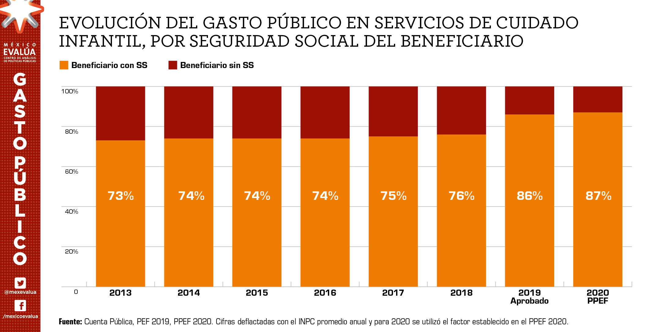 Al observar con más detalle el presupuesto destinado para servicios de cuidado infantil detectamos algo aún más grave. Al desagregar en madres y padres beneficiarios, con y sin seguridad social, vemos que, del total del presupuesto para estos servicios en el PPEF 2020, el 87% se destinará a derechohabientes del IMSS e ISSSTE. Sólo el 13% servirá para atender hijos de madres y padres sin seguridad social. En 2013 el porcentaje del presupuesto destinado a niños y niñas hijos de padres sin seguridad social era de 27%. Es decir, el presupuesto propuesto para 2020 implica una reducción de 14 puntos porcentuales para los niños cuyos padres no tienen seguridad social. Esta tendencia se observa desde 2013, pero en el PEF 2019 el presupuesto se reduce dramáticamente. En palabras domingueras: el presupuesto planea destinar menos recursos a las familias sin prestaciones sociales, que son aquéllos que no tienen acceso a la seguridad social, que no tienen acceso ni al IMSS ni al ISSSTE, mucho menos a servicios del sector privado, para empezar.