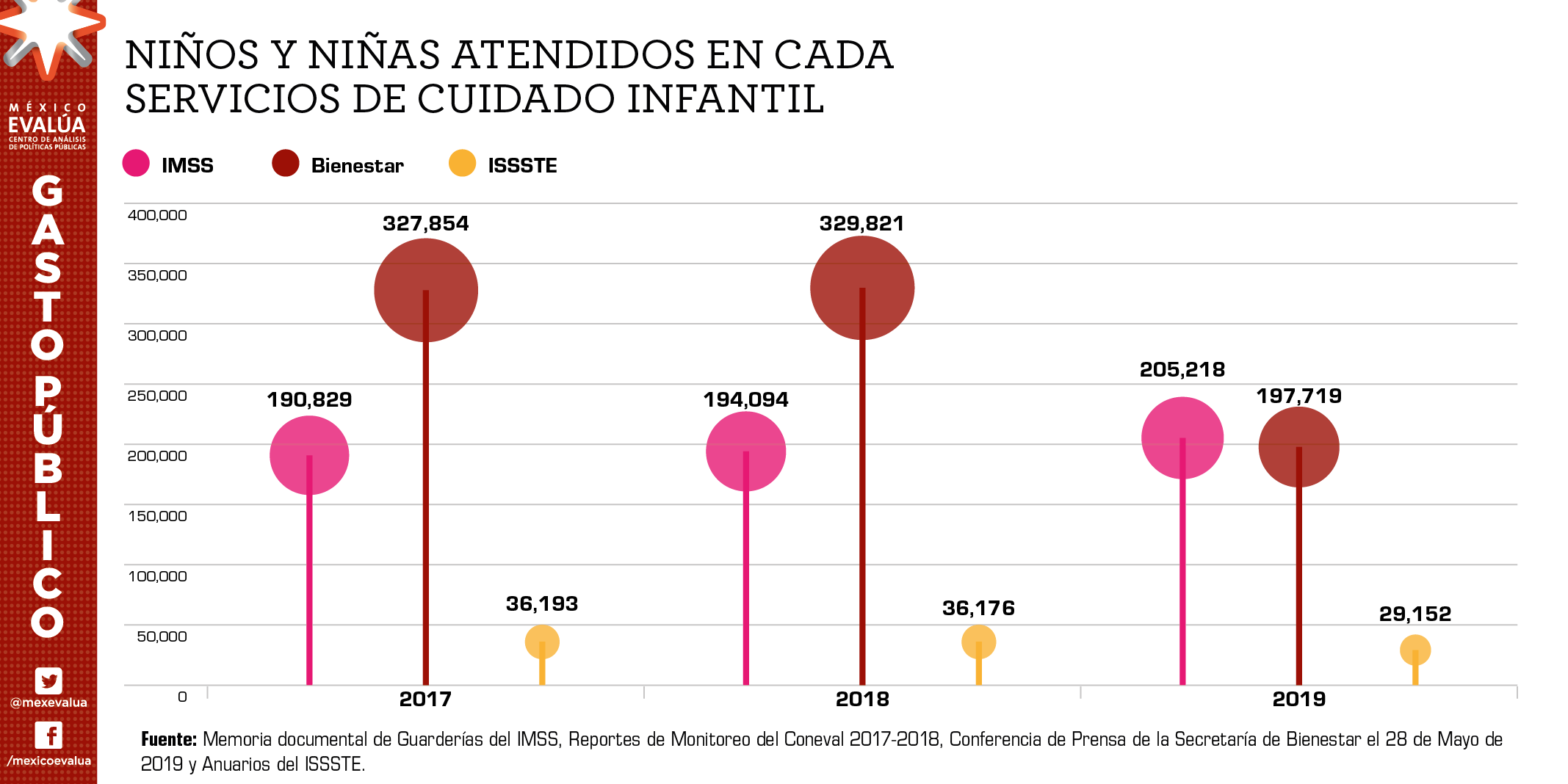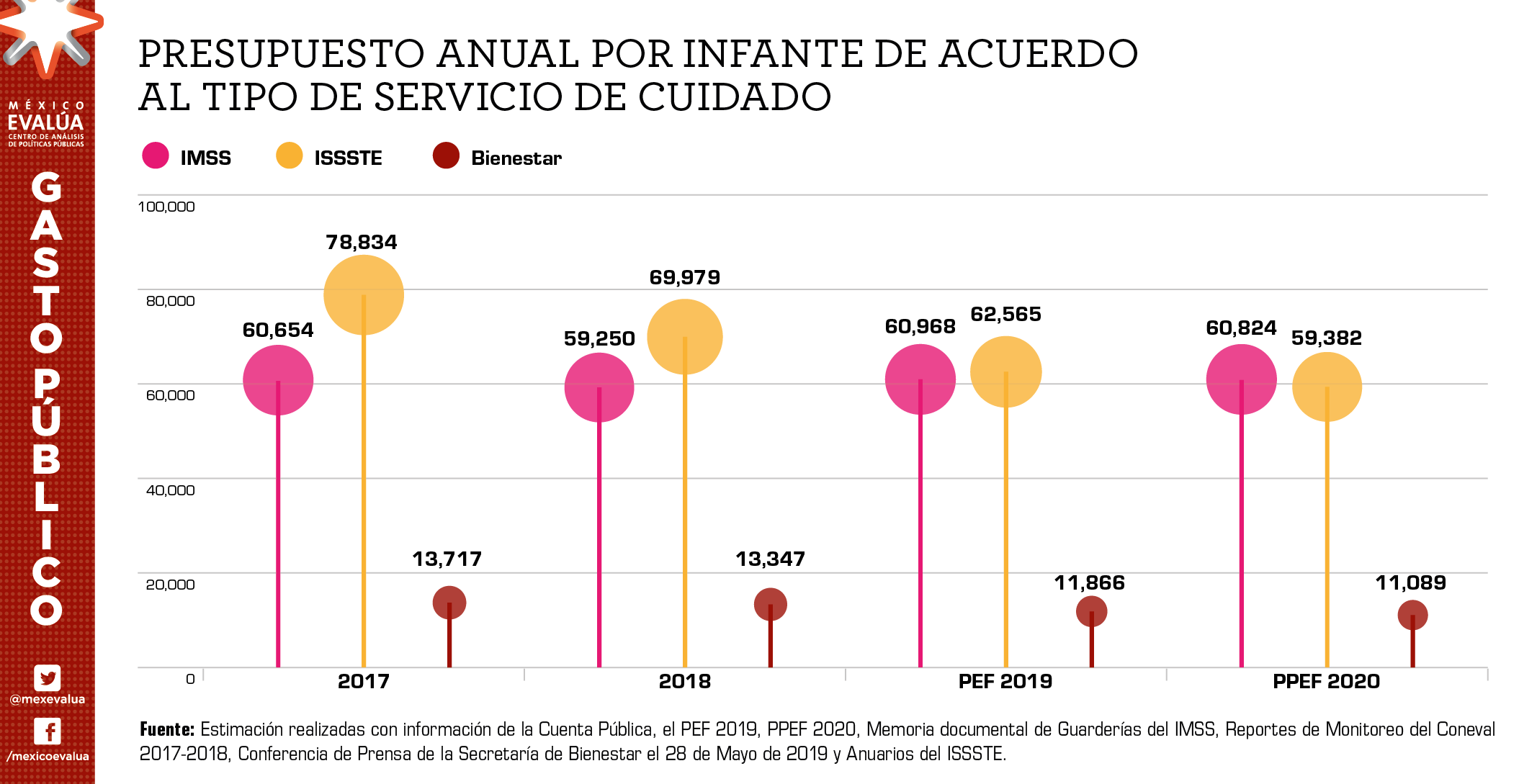 El Gobierno Federal destina más recursos por niño atendido en servicios de cuidado del IMSS e ISSSTE, que a los niños y niñas de familias sin seguridad social. Con los niños atendidos hasta junio de 2019, se calcula que se destinarán anualmente 60,968 pesos por niño en el IMSS y 59,382 pesos por niño atendido en el ISSSTE, mientras que por cada niño atendido a través del programa de la Secretaría de Bienestar durante 2019 sólo se erogarán 11,089 pesos[4].