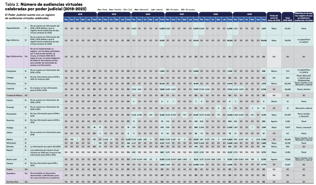 Sin embargo, eran pocos los poderes judiciales en México que habían implementado algunas herramientas tecnológicas antes de la pandemia de covid-19. Como lo documentamos en el Diagnóstico de implementación de herramientas tecnológicas en los poderes judiciales en México que publicamos en 2022, la contingencia obligó a la mayoría de los poderes judiciales del país a adoptar un abanico mucho más amplio de herramientas digitales para poder seguir ofreciendo sus servicios y dando acceso a la justicia pese a las medidas de distanciamiento social decretadas.