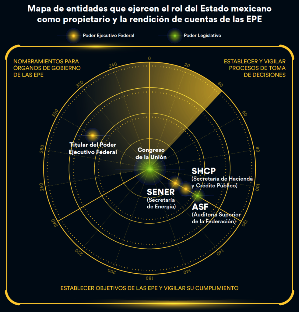 Desde una perspectiva de gobernanza, la complejidad de que el Estado sea dueño de empresas comienza con la tarea de identificar las entidades que lo representan como tal. En México esas entidades se configuran a modo de constelación de ‘vigilantes’ de las EPE. La desconcentración de sus funciones no es en sí misma un problema —o no lo es para los fines de este estudio—, pero sí lo es la falta de claridad en torno a ellas, verificada desde que las empresas dejaron de ser organismos descentralizados para convertirse propiamente en EPE con la Reforma Energética de 2013.