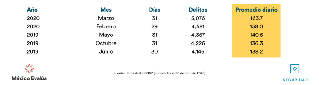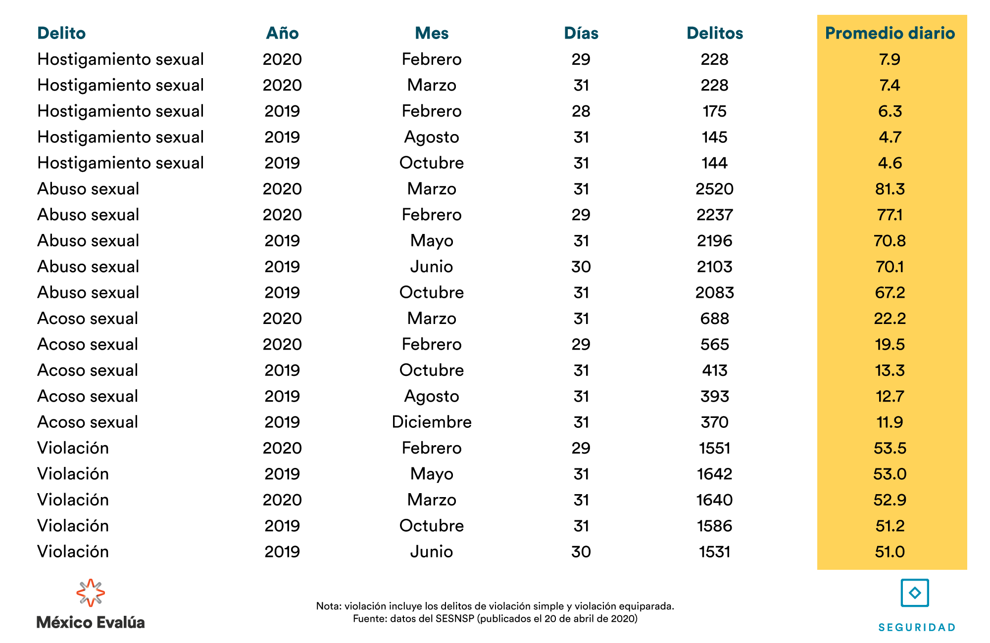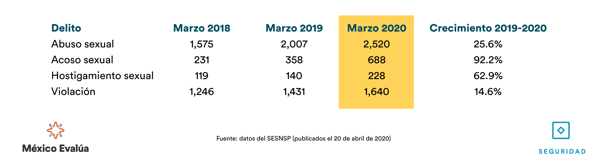 La violencia sexual, que afecta principalmente a mujeres, va en ascenso respecto a marzo de 2019. El acoso aumentó un 92.2%, seguido del hostigamiento sexual 62.9%, abuso sexual 25.6% y finalmente, la violación, con un incremento de 14.6% al pasar de 1431 violaciones a 1640 denuncias.