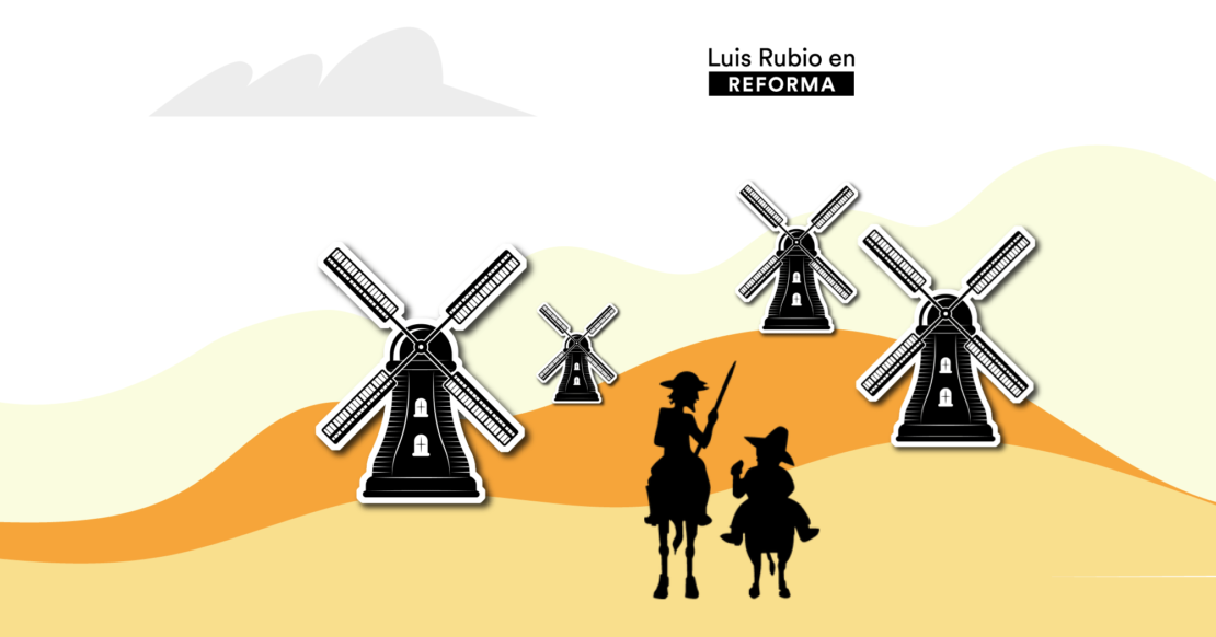 El Quijote y Sancho: el mundo de fantasía y el del sentido común, dos caras de una misma moneda. El Quijote prefiere la moral para avanzar sus causas y considera al sentido común como una pérdida de tiempo y energía. Sancho le advierte al Quijote que el gigante que desea atacar solo es un molino de viento y, como tal, debe dejarle en paz. Abandonar su sensatez, o más bien su sentido común, le dio al Quijote la libertad para involucrarse en tareas fútiles como atacar molinos de viento. Al final, los “gigantes de brazos largos” mantienen a la población lo suficientemente satisfecha y distraída como para olvidar sus problemas cotidianos. Pero esos problemas no desaparecen: anticipan el siguiente desengaño, la caída y el desánimo. O peor.