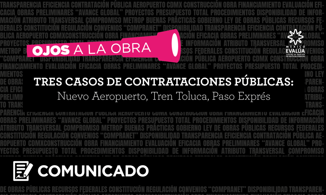 La mayor parte de las licitaciones abiertas observadas para tres proyectos emblemáticos –Tren Toluca, Paso Exprés y Nuevo Aeropuerto Internacional de la Ciudad de México- no cumple el estándar mínimo de competencia deseable. Así lo expuso Edna Jaime, directora general de México Evalúa, al presentar los resultados del primer análisis ¡Ojos a la Obra! que estudia las contrataciones públicas de estos tres proyectos. A partir de los resultados, la organización propone acciones para incrementar el valor que se obtiene a cambio de la inversión en obra pública en México.