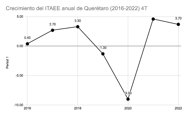 En los últimos años, Querétaro ha experimentado fluctuaciones significativas en su Indicador Trimestral de la Actividad Económica Estatal (ITAEE). Tras un crecimiento anual de 0.40% en 2016, Querétaro experimentó un pico de 3.3% en 2018. Sin embargo, el panorama cambió en 2019 y 2020, con una caída de -1.30% y -9.00%, respectivamente, lo que evidencia el impacto de factores externos como la pandemia global. En 2021 la economía mostró signos de recuperación, con un aumento en la actividad económica de 4.6% y 3.7% en 2021 y 2022, respectivamente. Querétaro vive un notable repunte, señal de una adaptación y fortaleza económica que bien puede impulsar el proceso de transición energética.