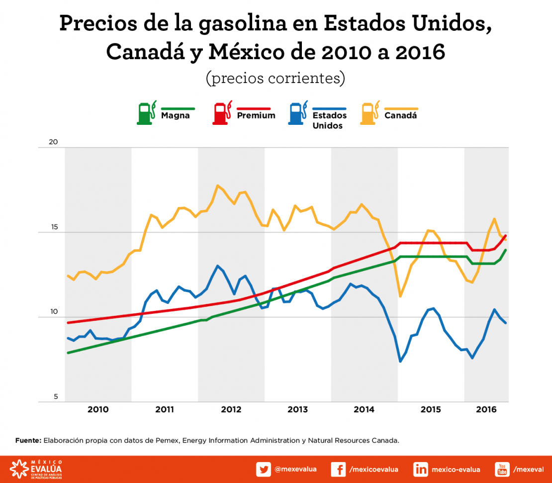 Precios de la gasolina en Estados Unidos, Canadá y México de 2010 a 2016
