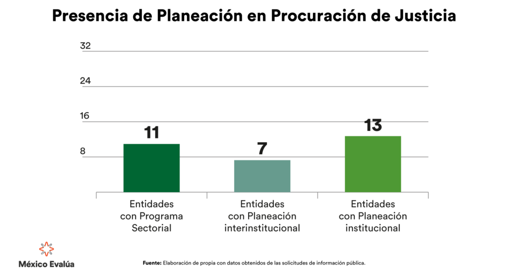 En nuestro reporte Hallazgos 2020, seguimiento y evaluación del sistema de justicia penal en México, observamos que sólo 11 entidades, incluyendo a la Federación, realizan un esfuerzo de planeación táctico; sólo siete estados hacen esfuerzos de planeación interinstitucional (sistémica) que den forma a la consolidación del SJP y sólo 13 entidades hacen planeación operativa al interior de alguna de las instituciones para la definición de los objetivos específicos y acciones con un horizonte de corto plazo.