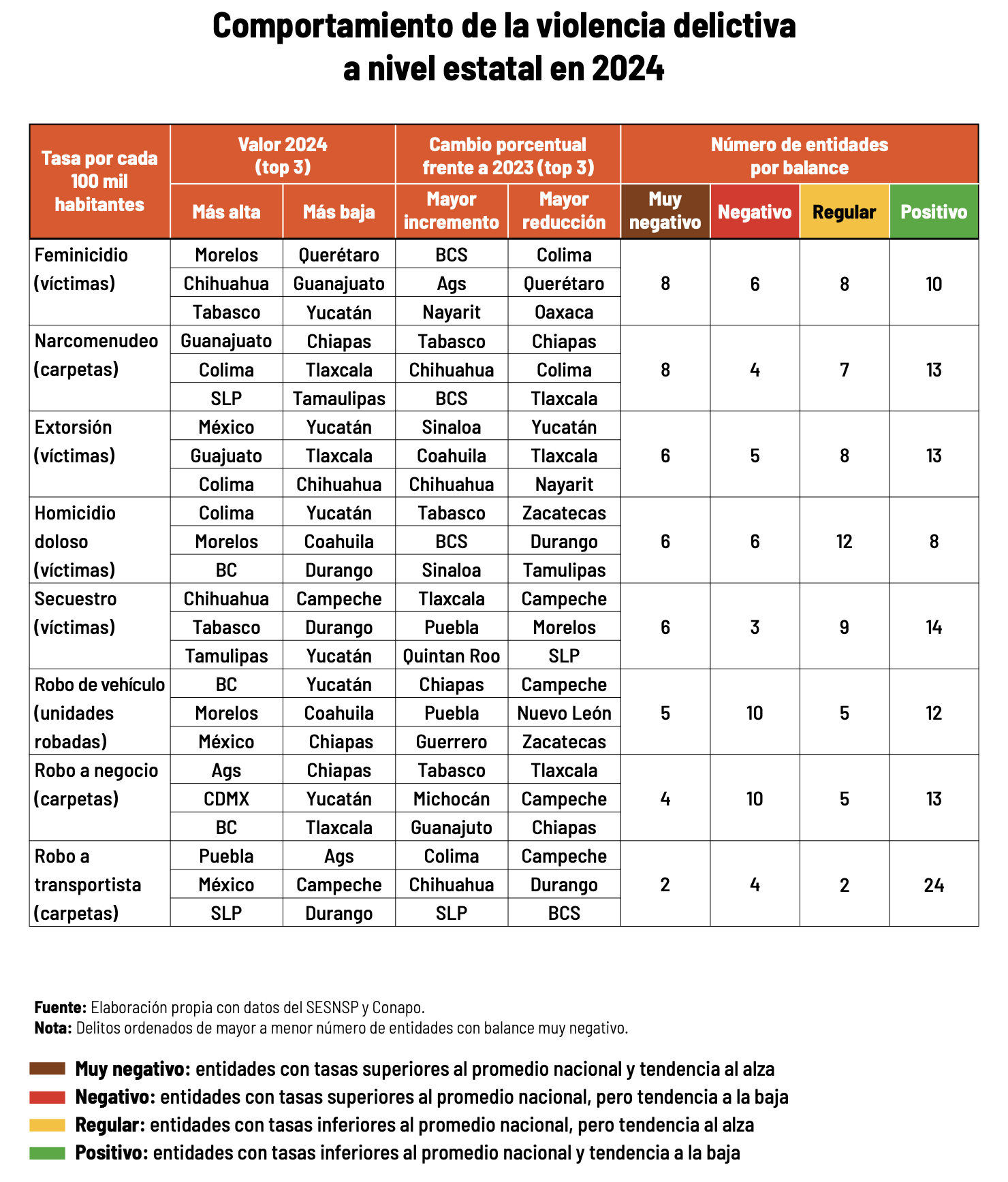 Los datos revelan diversos focos rojos. Existe más de una entidad federativa que requiere atención prioritaria y ésta cambia en función del problema específico. A su vez, la violencia criminal se encuentra altamente focalizada. Las entidades con balances muy negativos son minoría frente a los estados con balances positivos y mantienen ciertos patrones de concentración espacial.