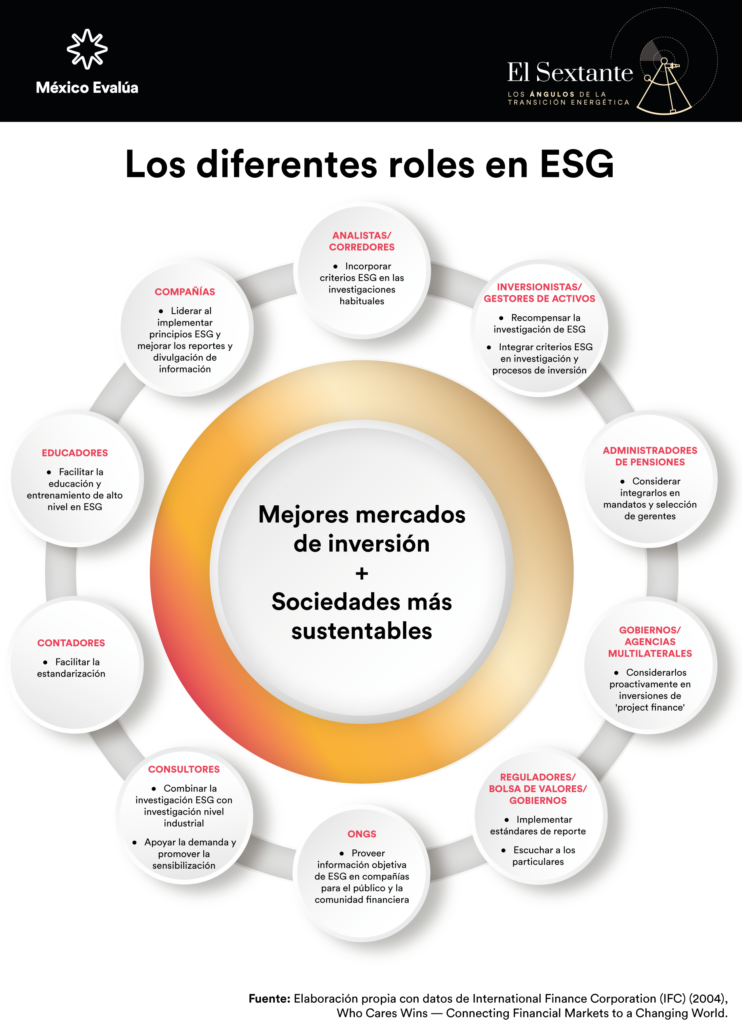 Aunque no sólo las compañías financieras tienen un papel en estos criterios. International Finance Corporation (IFC), del World Bank Group, ya visualizaba desde 2004 que el esfuerzo debía realizarse desde diferentes frentes. Así, en su reporte Who Cares Wins ubicó al menos 10 roles diferentes a través de los cuales, y de mejores inversiones en los mercados, se logren sociedades más sustentables. Los mostramos en la siguiente figura.