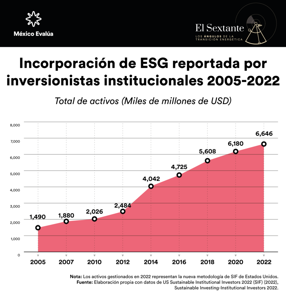 Mientras tanto, Estados Unidos sigue concentrando el porcentaje más alto de inversiones en activos sustentables. En 2020, ocupaba en 48% del total de inversiones sustentables (la mayoría, integradas en criterios ESG), mientras que Europa abarcaba un 34%, Japón 8% y Canadá un 7%. La inversión es significativa, aun con las críticas. Los activos reportados por la Sustainable Institutional Investors 2022 (SIF), que ya incorporaron ESG en 2022, llegaron a 6,646 millones de dólares, lo que representó un incremento de 346% en comparación con los activos que los incorporaban en 2005. Esto puede apreciarse en la siguiente figura.