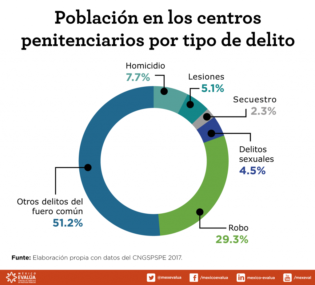 Por otro lado, dentro de la población privada de la libertad en 2016[vi], el robo fue el tipo de delito más frecuente y con mayor incidencia respecto a los demás delitos del fuero común. En 2015 el robo común representó el 36% de los delitos, 35% en 2016 y 36.7% en 2017[vii]. Entonces, ¿la prisión está contribuyendo a disminuir los delitos? Los datos indican que no es así.