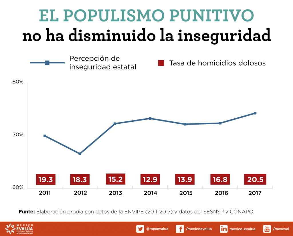No existe evidencia que demuestre que el aumento en las penas disminuye la incidencia delictiva o contribuye siquiera a mejorar la percepción de inseguridad. De hecho, los números apuntan hacia otra dirección. Desde que inició el levantamiento de la ENVIPE, la percepción de inseguridad ha ido en aumento, llegando a su punto máximo en 2017 (74%). Por otro lado, en los últimos 17 años, la incidencia delictiva nacional ha presentado un aumento de un 22.4%, destacando el caso de los homicidios dolosos. Para 2017 el Secretariado Ejecutivo reportó la tasa de homicidios dolosos más alta desde que se tiene registro, con 20.51 homicidios por cada cien mil habitantes.
